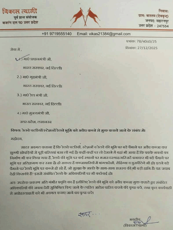 देवबंद। बजरंग दल के पूर्व प्रांत संयोजक विकास त्यागी द्वारा देशभर में रेलवे की भूमि पर अवैध कब्जों के संबंध में पीएम, गृह मंत्री और प्रदेश के मुख्यमंत्री योगी आदित्यनाथ को लिखे गए पत्र का जिला प्रशासन ने संज्ञान लिया है। मंडलायुक्त ने मंडल रेल प्रबंधक अंबाला को इस संबंध में जांच कर कार्रवाई करने के लिए पत्र लिखा है।