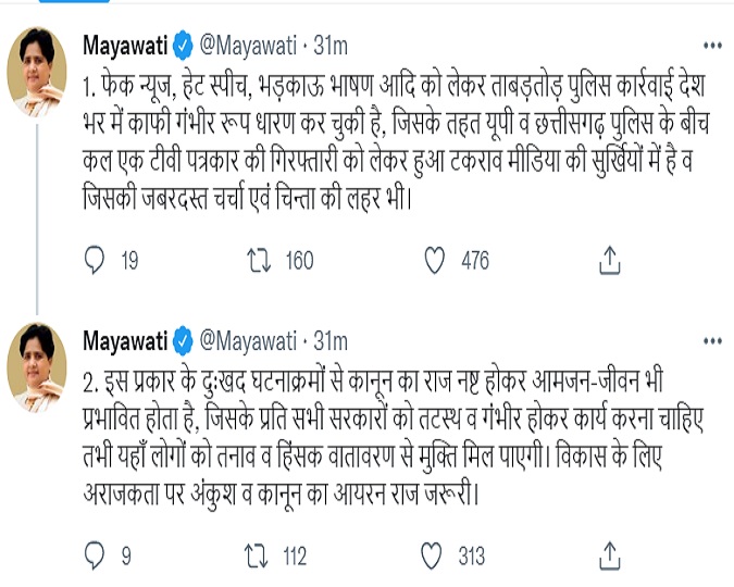 बसपा चीफ मायावती ने ट्वीट कर कहा कि, ‘फेक न्यूज, हेट स्पीच, भड़काऊ भाषण आदि को लेकर ताबड़तोड़ पुलिस कार्रवाई देश भर में काफी गंभीर रूप धारण कर चुकी है, जिसके तहत यूपी व छत्तीसगढ़ पुलिस के बीच कल एक टीवी पत्रकार की गिरफ्तारी को लेकर हुआ टकराव मीडिया की सुर्खियों में है व जिसकी जबरदस्त चर्चा एवं चिन्ता की लहर भी।
