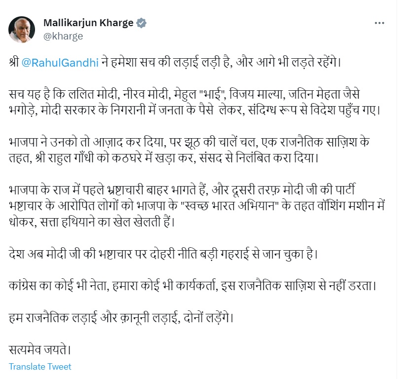 खरगे ने आगे कहा, भाजपा ने राहुल गांधी को संसद से निलंबित करने के लिए “राजनीतिक साजिश के तहत झूठ का इस्तेमाल किया।”