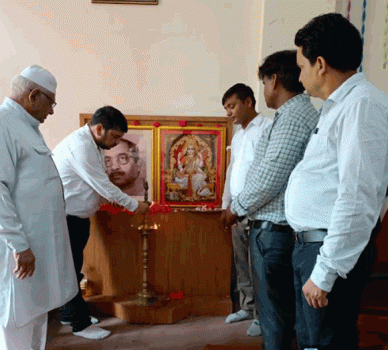 कार्यक्रम का आरम्भ शोभित विश्वविद्यालय गंगोह के कुलपति प्रो.(डॉ.) रणजीत सिंह, संस्था के केयर टेकर सूफी ज़हीर अख्तर एवं शिक्षकगण ने मां सरस्वती एवं बाबू विजेंद्र जी की प्रतिमा के समक्ष दीप प्रज्वलन कर किया।