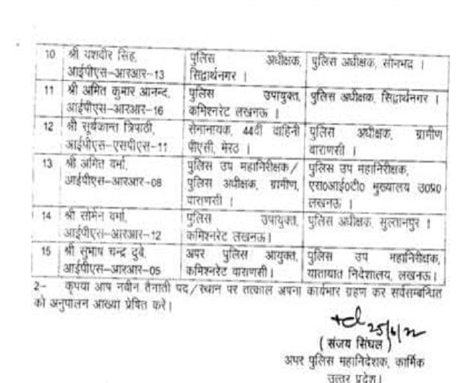 आईपीएस अमित वर्मा वर्तमान में वाराणसी में पुलिस उप महानिरीक्षक/ पुलिस अधीक्षक के पद पर तैनात थे उन्हें पुलिस उपमहानिरीक्षक मुख्यालय उत्तर प्रदेश लखनऊ में नवीन तैनाती दी गई है। आईपीएस सोमेन वर्मा वर्तमान में लखनऊ में पुलिस उपायुक्त के पद पर तैनात थे उन्हें सुल्तानपुर का पुलिस अधीक्षक (कप्तान) नियुक्त किया गया है। आईपीएस सुभाष चंद्र दुबे वाराणसी कमिश्नरेट में अपर पुलिस आयुक्त के पद पर तैनात थे उन्हें पुलिस उपमहानिरीक्षक यातायात निदेशक निदेशालय लखनऊ में नवीन तैनाती दी गई है