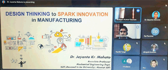 इस ऑनलाइन संगोष्ठी में मुख्य वक्ता डॉ. जयंता कुमार महतो एसोसिएट प्रोफेसर शोभित डीम्ड यूनिवर्सिटी, मेरठ रहे, जिसमे इन्होने सभी छात्र एवं छात्राओं को नवाचार एवं डिज़ाइन इन मैन्युफैक्चरिंग के सन्दर्भ में प्रेरित कर इसके द्वारा कार्य कुशलता को बढ़ावा देने हेतु मार्गदर्शन किया। उन्होंने आगे बताया कि किस प्रकार निर्माण और उत्पादन प्रक्रिया के दौरान विभिन्न बिंदुओं पर अक्षमताओं की पहचान, मात्रा और उन्मूलन को भी यह दृढ कर सकता है।